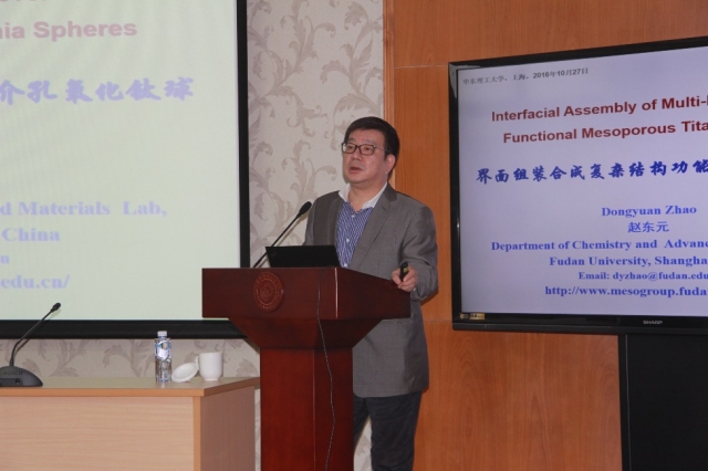 长李春忠教授邀请,中国科学院院士、复旦大学教授赵东元来校进行学术交流,作了题为界面自组装合成复杂结构功能介孔氧化钛球的学术报告。报告会由李春忠主持,部分教授、研究生聆听了报告。