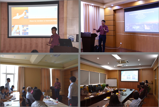 师生带来了两场报告,分别为“Bioengineering of Direct Cellular Reprogramming”和“How to publish on Biomaterials”。报告会由刘昌胜主持。Leong教授首先介绍了直接细胞重编程技术。直接细胞重编程是指不经过中间干细胞的阶段,直接将成熟细胞从一个谱系经过重编程转化为另一个谱系,产生能应用于再生医学的细胞。它避免了药物及胚胎的使用,并最大限度地降低了将诱导的多功能干细胞应用于人体导致畸胎瘤形成的风险。它还可以产生用于疾病建模和药物筛选的细胞。随后,Leong教授介绍了目前他们的团队通过直接细胞重编程技术将人内皮祖细胞(hEPC)转化为诱导的平滑肌细胞(iSMC),将hEPC转化成诱导的骨骼肌细胞(iSkM),以及将人成纤维细胞转化成诱导的心肌细胞样细胞(iSML),并将小鼠成纤维细胞转化成诱导的神经元。在第二场报告中, Leong教授针对如何撰写学术文章以及文章投稿、审稿等大家关心的话题作了详细介绍。