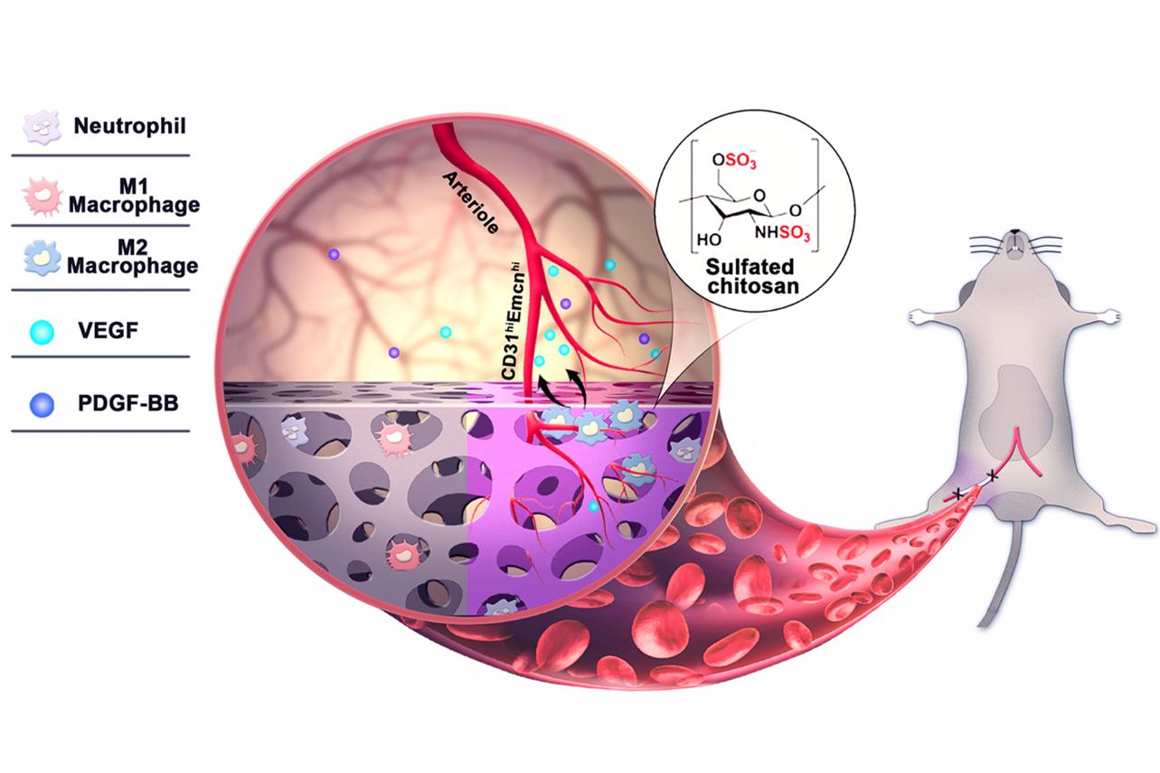 研究发现SCS在无外源性生长因子的参与下,通过调控巨噬细胞向M2极化,刺激其分泌内源性VEGF可有效诱导缺血组织中功能性血管的新生,并且指出磺酸基团和糖链结构对诱导血管新生均十分重要,两者缺一不可。该研究为未来新型促血管化材料的设计及制备提供了新思路。