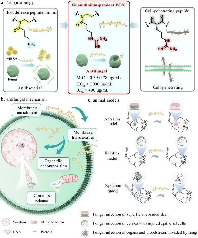 刘润辉教授研究团队在前期研究中首次发现聚(2-噁唑啉)可以作为新一类的功能性多肽模拟骨架结构,并以侧链氨基功能化的聚(2-噁唑啉)模拟宿主防御肽获得高效抗耐药细菌聚合物(Angew. Chem. Int. Ed. 2020, 59, 6412-6419,VIP 论文, inside cover,高被引论文)。在前期工作的基础上,近日刘润辉教授研究团队受细胞穿透肽启发,通过模拟宿主防御肽设计了一种短链长的胍基功能化聚(2-噁唑啉),能够有效穿透真菌细胞膜从而杀死真菌,实现了体外高效的选择性抗真菌功能和体内出色的抗耐药真菌感染治疗效果,为设计新型高效选择性抗真菌化合物以对抗耐药真菌感染提供了一种新策略。
