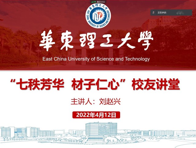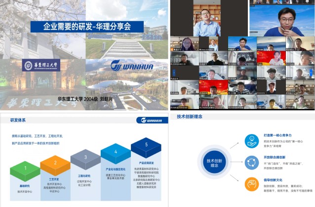 刘赵兴校友从个人职业发展历程、企业研发体系、具体研发案例三个板块进行介绍。他从一名毕业生的视角,讲述了自2013年博士毕业加入万华化学至今在产品研发岗、应用技术经理岗、部门业务和技术负责人等不同岗位的角色定位和职业发展历程,目前团队研发产品年销售额30亿左右,其中4个产品处于世界第一水平。他从“打造第一核心竞争力”“开放联合”“倡导创新文化”等阐释了企业技术创新的理念,介绍了由基础研究、工艺开发、工程化研究、产业化与园区优化、产品应用研发构成的企业研发体系。结合“塑胶跑道”“瓷砖产品”等具体案例,阐释了“更环保”“更美观”“更高效”的研发实效。