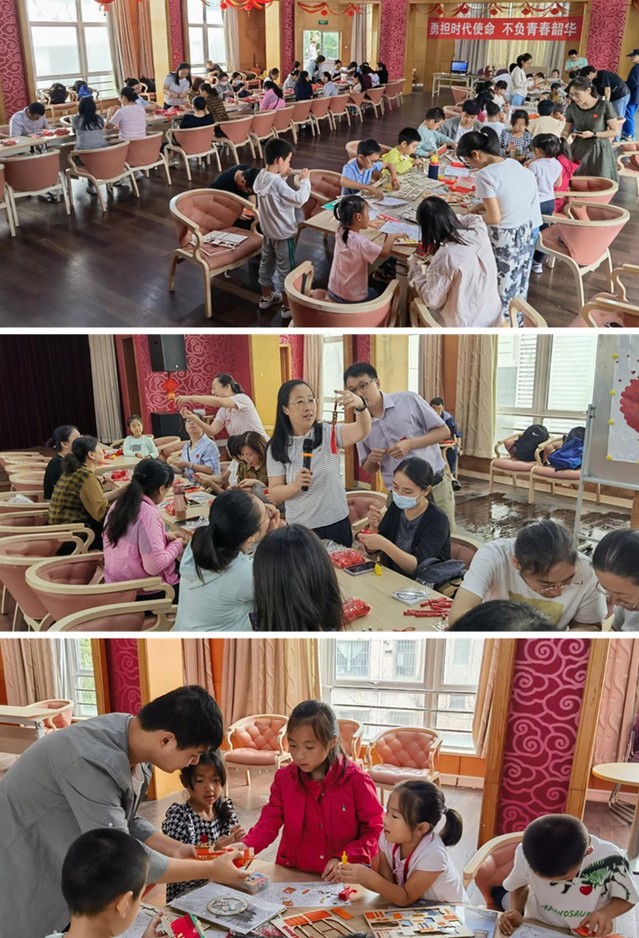 在接下来的亲子DIY环节,小朋友们在志愿者们的帮助下展开了拼图大比拼。红船、火箭、天安门,一个个精致模型呈现在大家面前。家长们则在王以群老师的指导下动手编制精美的中国结挂件。