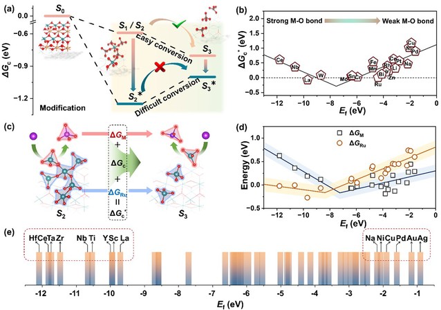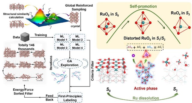 清洁能源材料与器件团队通过机器学习解析酸性分解水阳极析氧反应(OER)中RuO2催化剂动态演化过程的最新研究成果。该研究利用自主开发的主动学习工作流程,解析了酸性OER中RuO2表面结构动态演化过程,建立了原位下结构-稳定性-活性关系,提出了“倒火山型曲线”的改性规则。该研究成果将为酸性OER中RuO2催化剂活性结构的原位认知和理性设计提供重要理论基础,助力质子交换膜(PEM)水电解制氢目标。