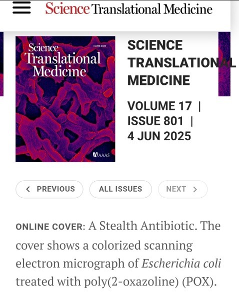 刘润辉教授课题组报道了一种感染部位原位激活的宿主防御肽模拟前药设计策略,所开发的抗菌前药可有效治疗耐药阴性菌感染。该研究成果以“A host defense peptide-mimicking prodrug activated by drug-resistant Gram-negative bacterial infections”(一种由耐药阴性菌感染激活的宿主防御肽模拟前药)为题发表在国际权威学术期刊《科学·转化医学》,并被选为当期正封面文章(Sci. Transl. Med.2025, DOI:10.1126/scitranslmed.adl4870)上。